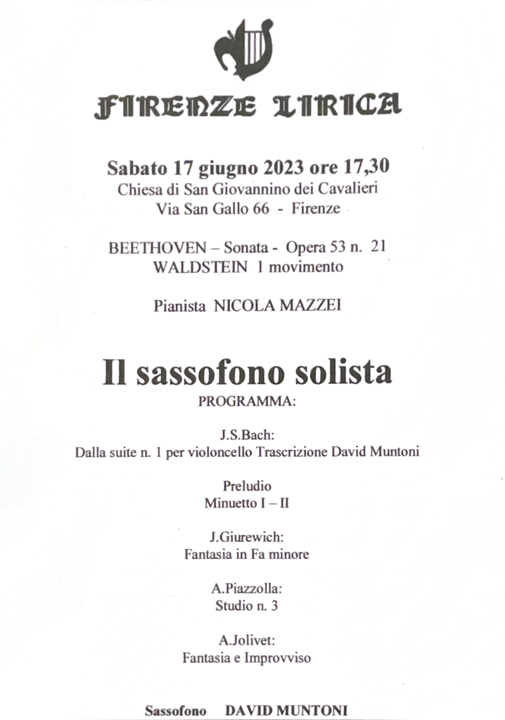 17 GIUGNO 2023 FIRENZE LIRICA PRESENTA “IL SASSOFONO SOLISTA”