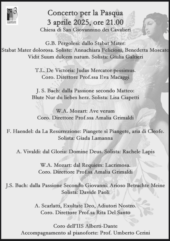 Nell’ambito della collaborazione con il Liceo Alberti-Dante il concerto Pasquale del coro dell’istituto Alberti Dante, al pianoforte il prof. Umberto Cerini.